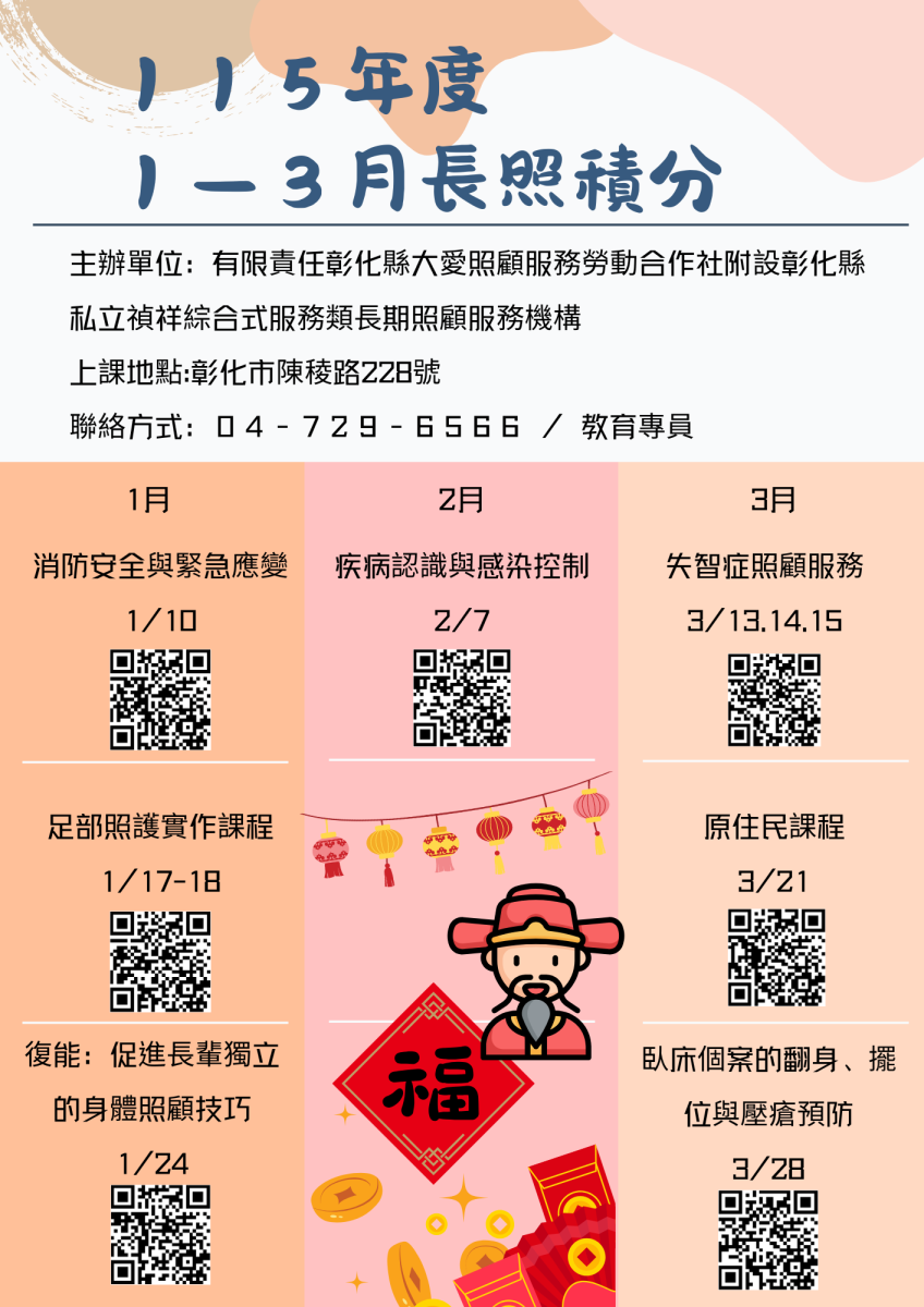 想一次補齊長照積分、提升實務能力嗎? 從🔥消防安全、🦠感染管制、🧠失智照顧,到💪復能照護、🛏臥床翻身與壓瘡預防, 課程內容實用、師資專業,讓你學得會、用得上!