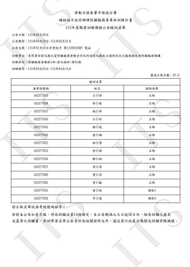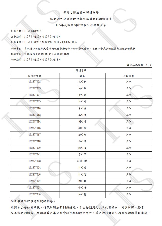 照顧服務員職前1班(彰化禎祥) 甄試結果