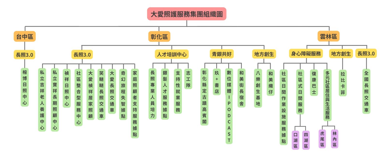 服務創新為大愛照護服務集團永續經營的重要關鍵,在經營上總是秉持著新的想法,做出改變。在吸納專業優秀人才的同時,也開拓不同事業版圖,為未來創造更多的可能性,進而逐步的擴大規模。期盼大愛將來能在照顧產業中,創新成長、引領脈動,成為中彰投照顧第一標竿,並打造中彰投全人照顧服務創新的領導者。