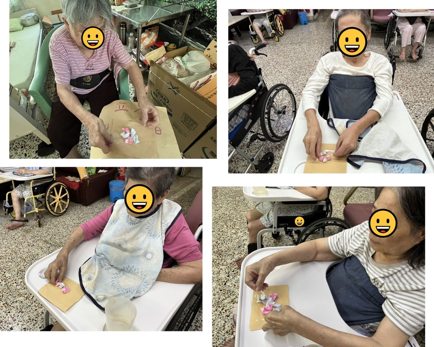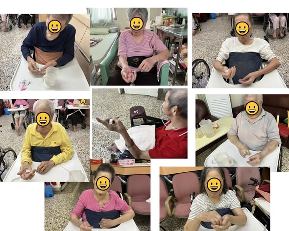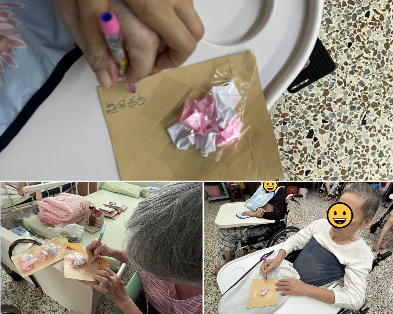 多數長輩的手部力量比較弱,我就一個個協助他們慢慢搓揉。長輩們都很有耐心,也很開心看到自己完成的作品,還寫上祝福語:「平安吉祥」