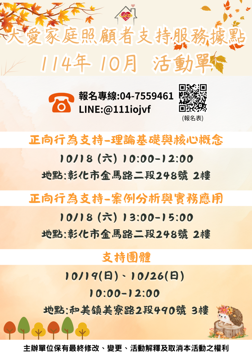 誠摯邀請據點的個案參與 10/19 (日) 及 10/26 (日) 上午 10:00-12:00 的最後兩堂支持團體~